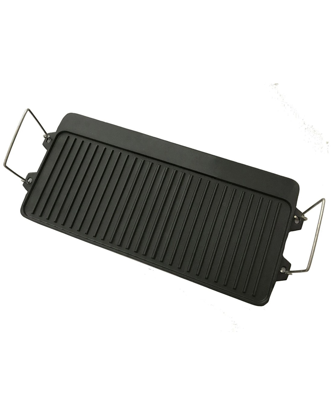 This durable cast iron griddle features a reversible design with ribbed and smooth sides, allowing you to switch between different cooking styles easily. Steel handles on each side ensure safe and convenient handling, whether you are setting up or packing away.
