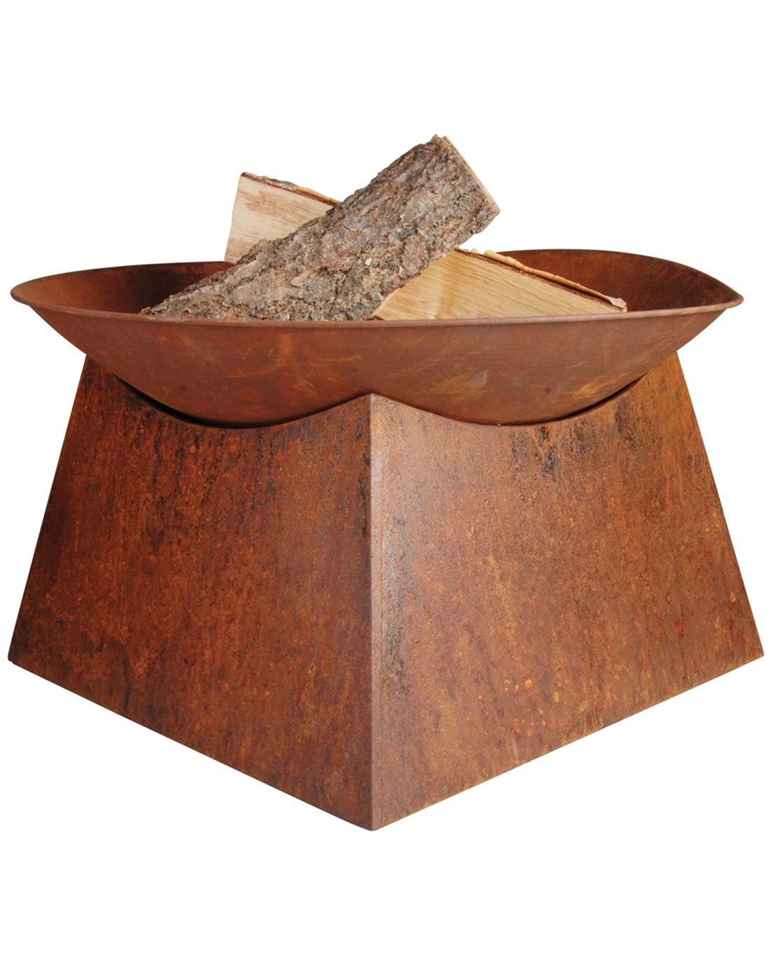 Made from rust-coloured iron sheet, it features a square base measuring 56.5 x 56.5 x 34cm, providing ample space for firewood and socialising around the fire. Its weather-resistant construction ensures durability for outdoor use, making it a reliable addition to your patio or garden.