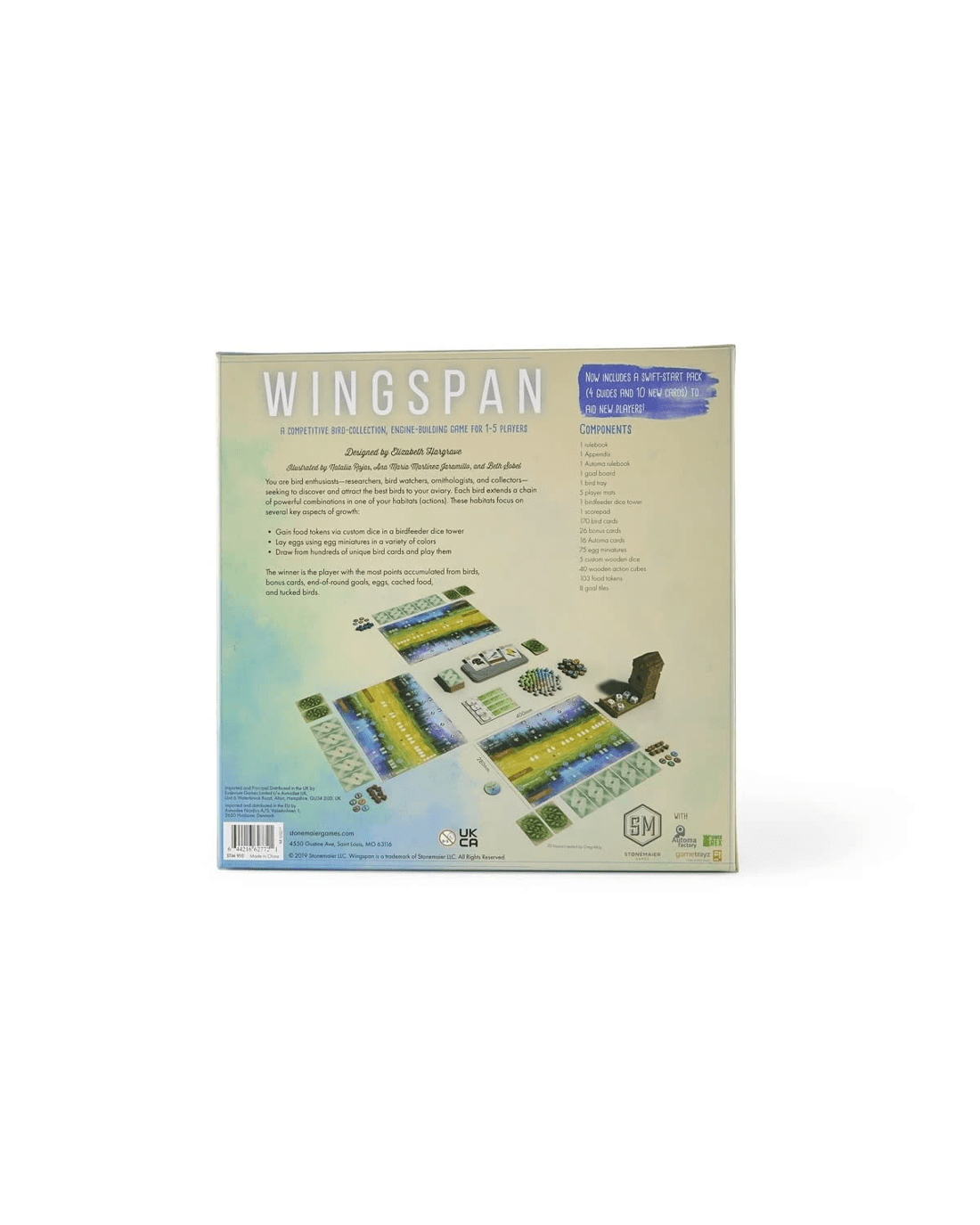 Wingspan is a competitive, medium-weight, card-driven, engine-building board game from Stonemaier Games. It's designed by Elizabeth Hargrave and features over 170 birds illustrated by Beth Sobel, Natalia Rojas and Ana Maria Martinez.