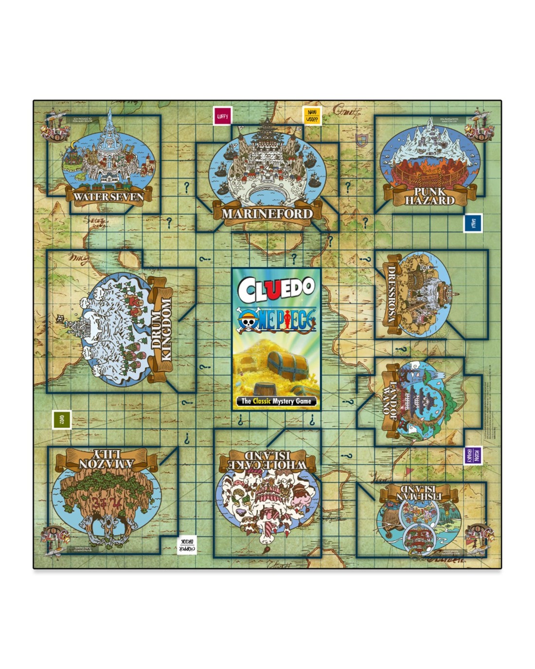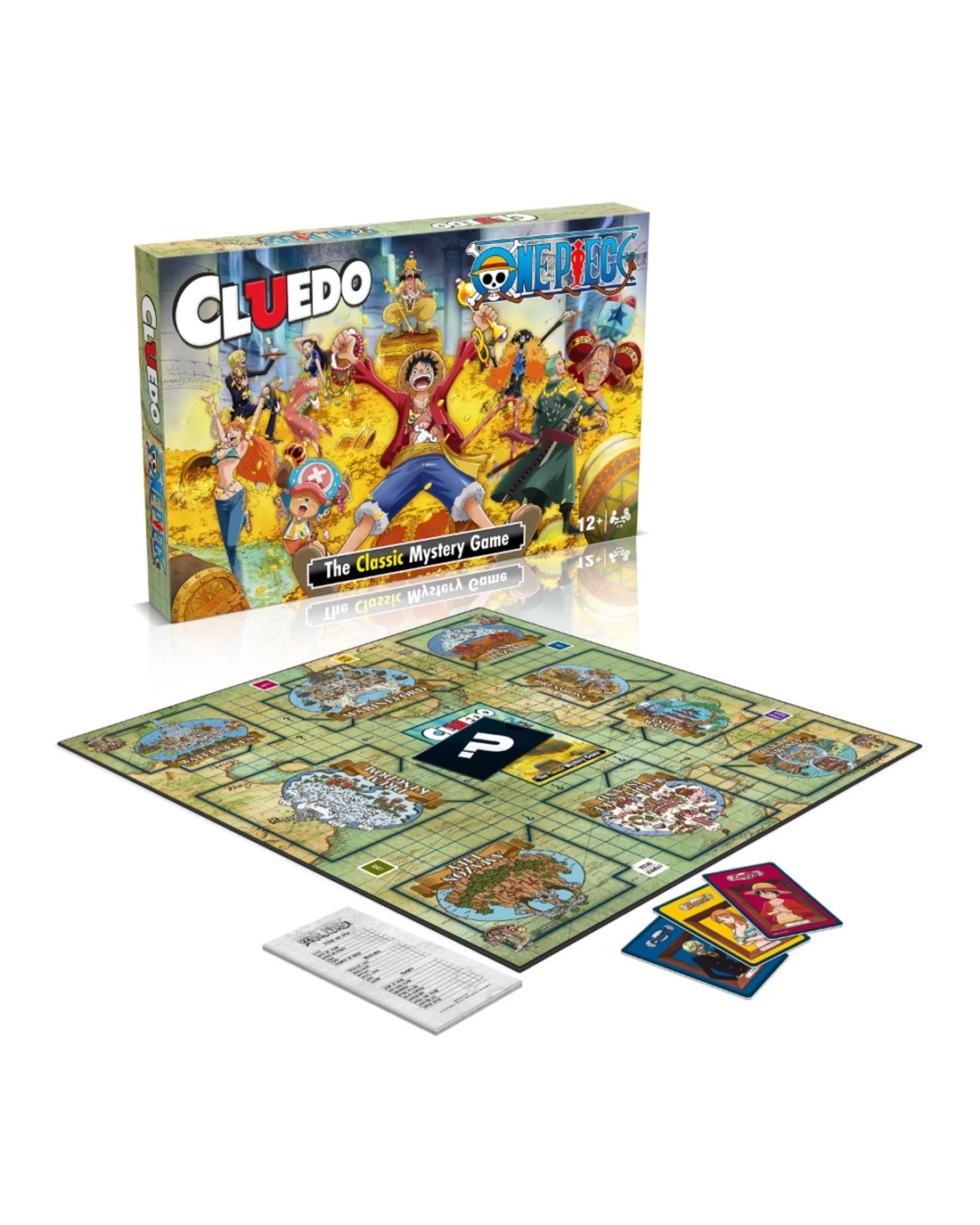 Join an adventure with the Straw Hat Crew! The Straw Hat Pirates and their Captain Luffy set out to travel the oceans to faraway islands in search of treasure! With each clue they discover along the way, they're one step closer to glory! Choose your Crew Member and see which island holds the coveted treasure. In One Piece Cluedo, it's up to you to determine who has discovered the treasure, what it is, and where it is hidden. Was it Nami, with the Binoculars, at Marineford? Or Chopper, with the Meat, on Wholecake Island? Move around the board and pick up Adventure cards to gain the advantage over your opponents, and use your character's unique Equipment card to outsmart your foes. Will you use Devil's Fruit to cause chaos and confusion, or will the impostor pirates force you to reveal your cards? Watch out for the Villain cards, because when all 8 are revealed, the game is over! Perfect for One Piece fans and aspiring detectives looking for a new challenge, this fresh new edition of Cluedo is sure to please players young and old. Ages: 12 + | Players: 2 - 5