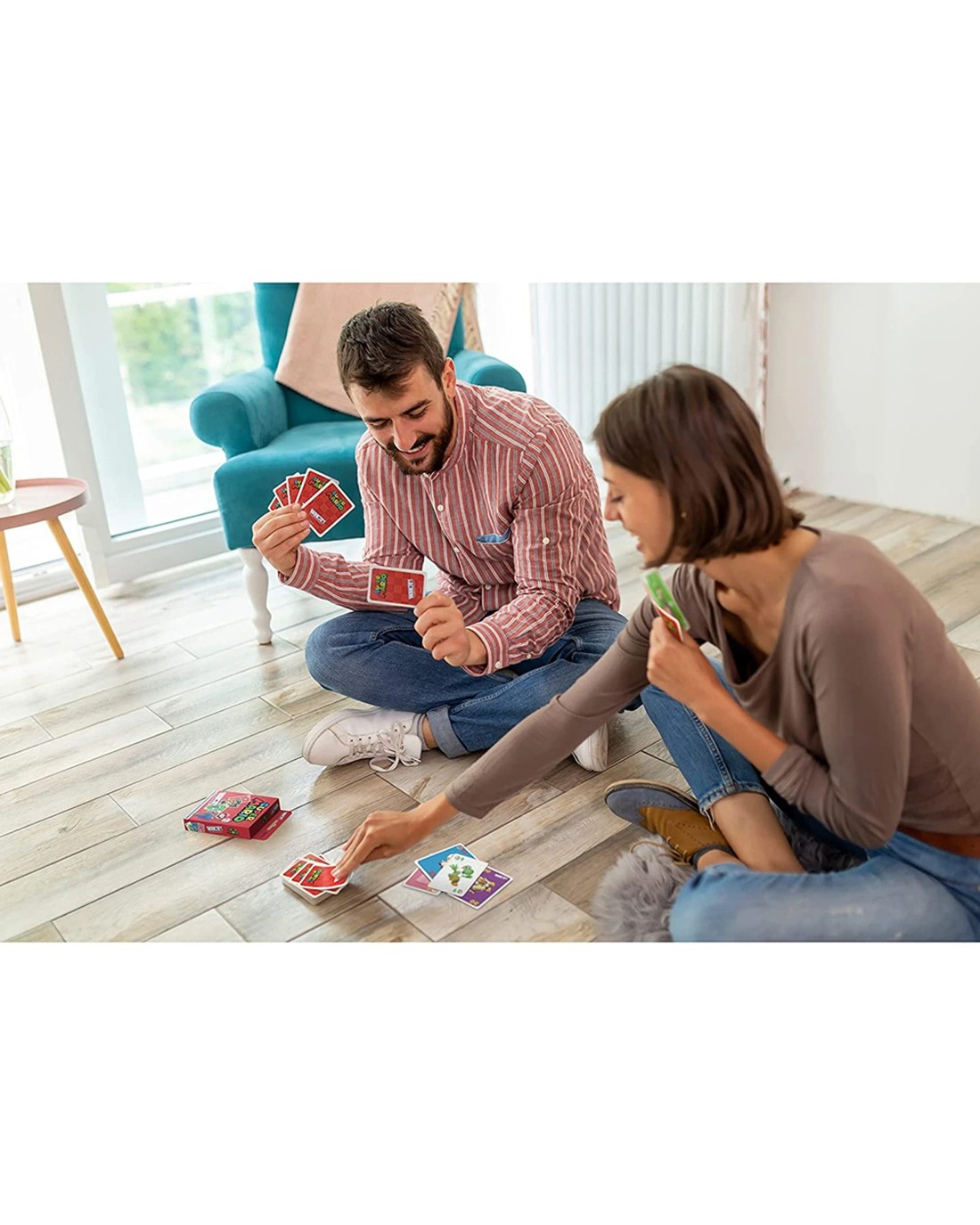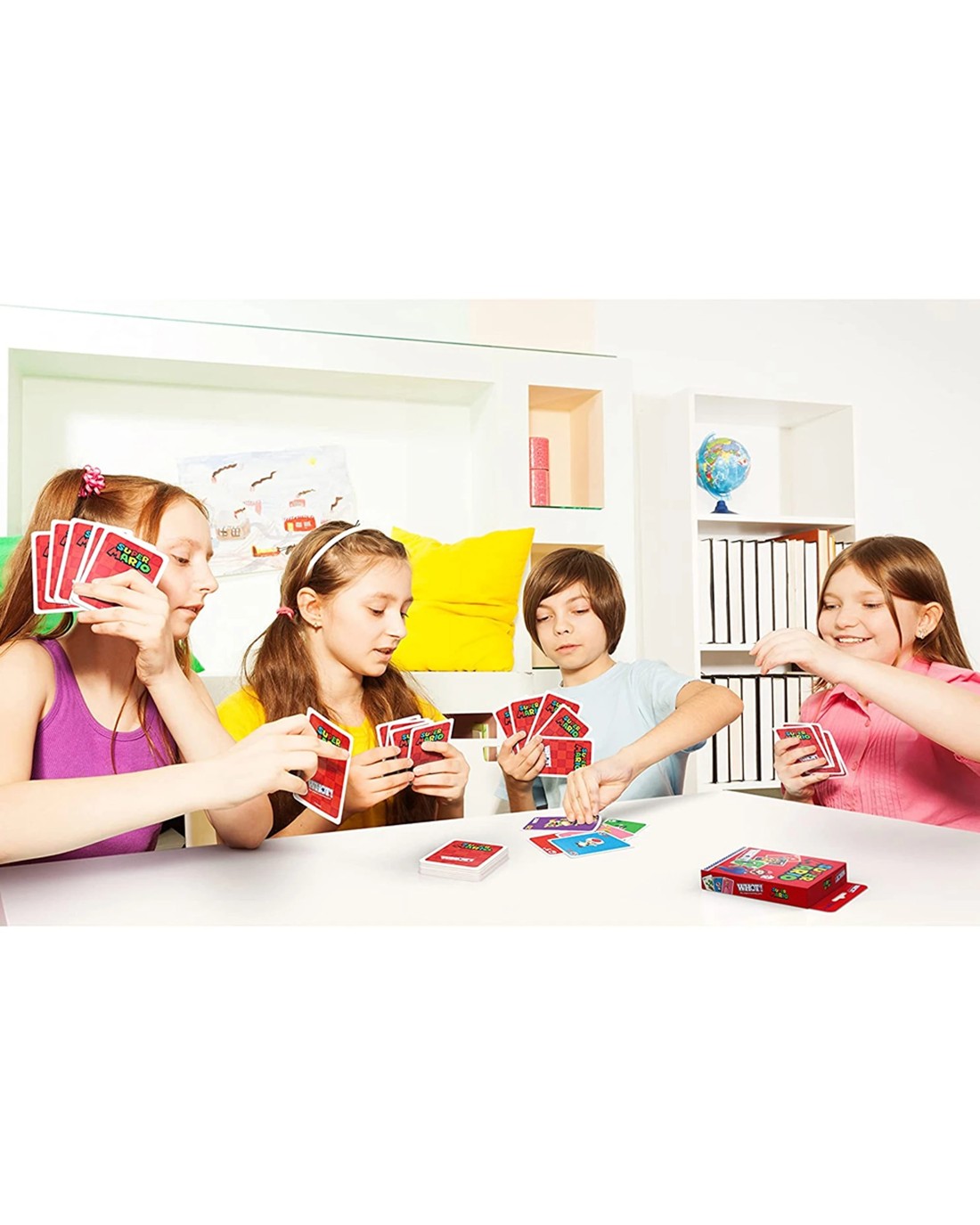 Invite your friends and family to the Mushroom Kingdom with this beautiful new Super Mario edition of WHOT!, the original matching game. Take turns matching shapes, numbers, and characters including Mario, Luigi, Yoshi, Peach and Toad, and be the first to get rid of all your cards. Use the special Bowser and Bowser Jr. WHOT! cards, which can represent any number or shape you choose, to reverse the flow of gameplay and disrupt your opponents' schemes! This charming card game requires memory, strategy and quick thinking to win. With 53 high-quality playing cards, this is the perfect time to take a break from stomping Goombas and enjoy this classic card game, with a special Nintendo twist. Ideal for playing at home, on holiday or on the move, this game comes complete with the Official Nintendo Licensed Product seal, so you can be confident that you're buying a quality product, that's perfect as a gift or treat. Ages: 5 + | Players: 2 +