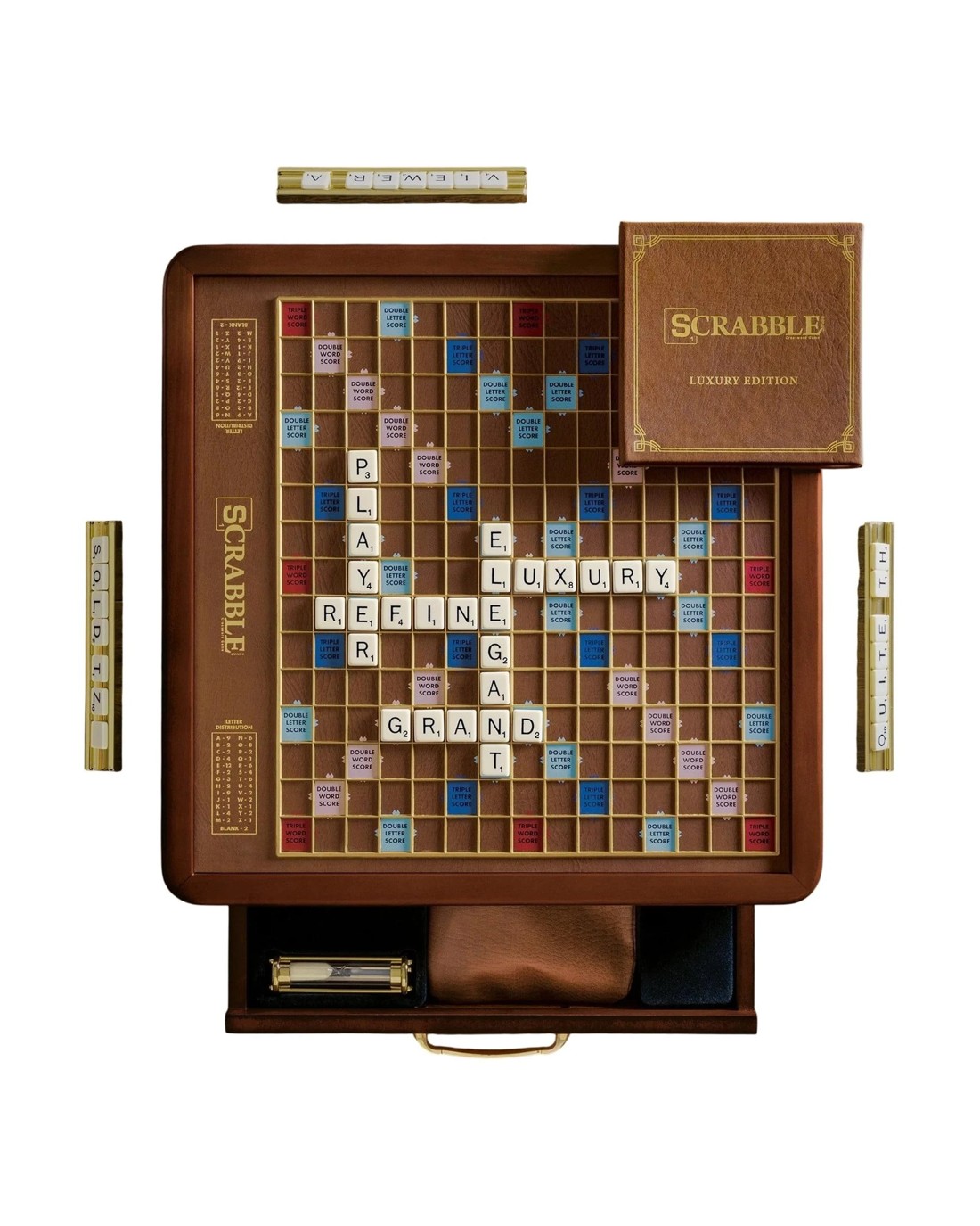 A refined and richly detailed edition designed for word lovers with discerning taste. This luxurious Scrabble set features a stunning wood cabinet with burled veneer panels, decorative metal plaques, and a rotating faux leather game surface with a raised letter grid and gold foil detailing. A die-cast metal drawer pull reveals built-in storage and a full suite of beautifully crafted components. Inside the drawer, you'll find plated die-cast metal tile racks, faux ivory letter tiles, and a deluxe faux leather scorebook with gold foil stamping and coordinating pencil. A matching faux leather tile pouch with drawstring completes the set. With premium finishes and elegant presentation, this collector-worthy edition brings refined sophistication to every game night. Ages: 10 + | Players: 2 - 4 | Playtime: 90 min