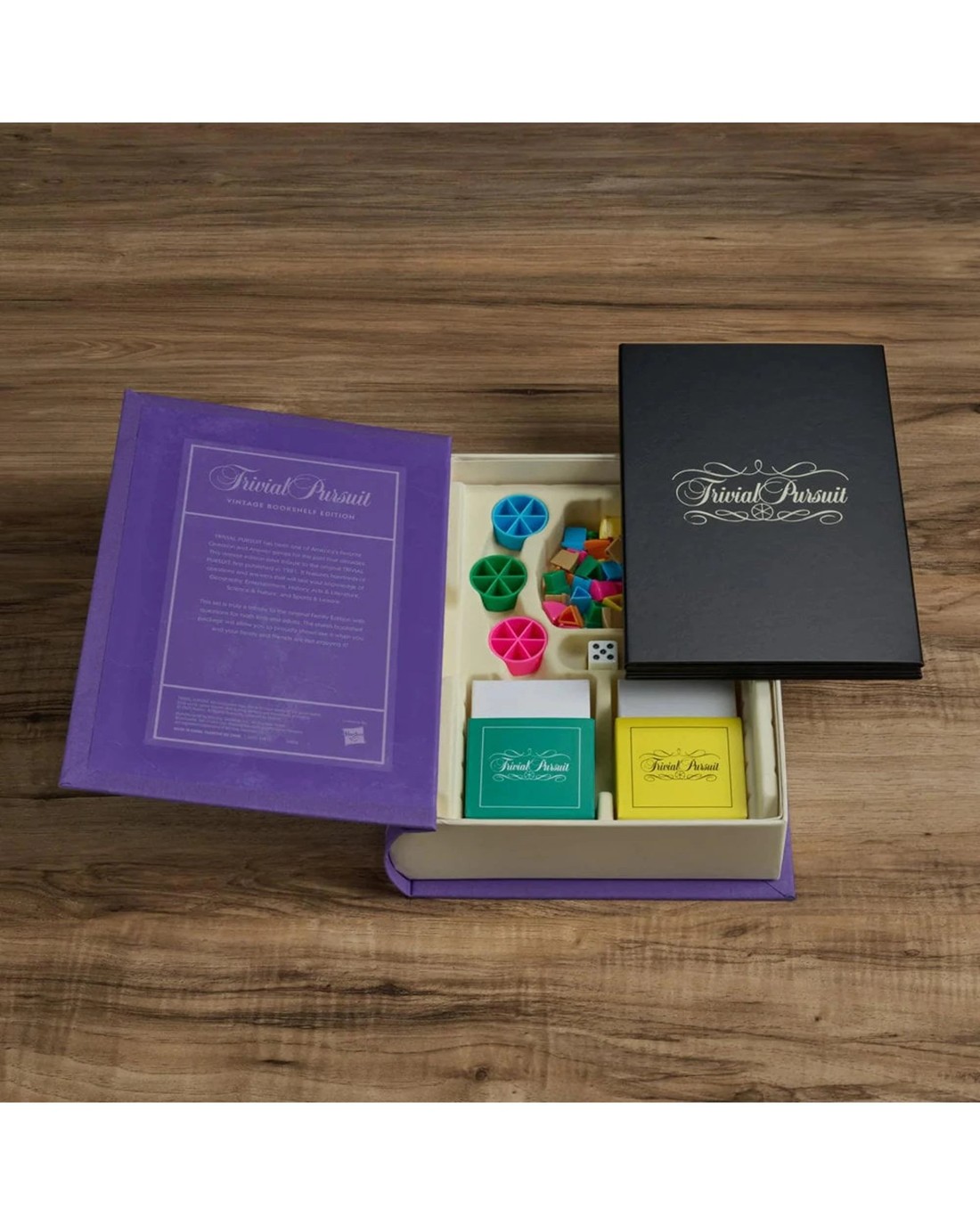 Trivial Pursuit has been one of America's favorite Question and Answer games for the past four decades. This vintage edition pays tribute to the original Trivial Pursuit, first published in 1981. It features hundreds of questions and answers that will test your knowledge of Geography, Entertainment, History, Arts & Literature, Science & Nature, and Sports & Leisure. This set is truly a tribute to the original Family Edition with questions for both kids and adults. The stylish bookshelf package will allow you to proudly showcase it when you and your family and friends are not enjoying it! Ages: 8+ |Players: 2 + | Playtime: 60min