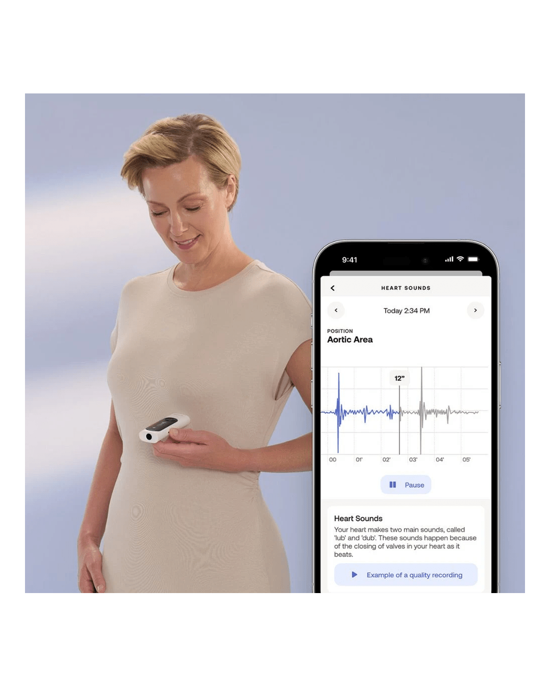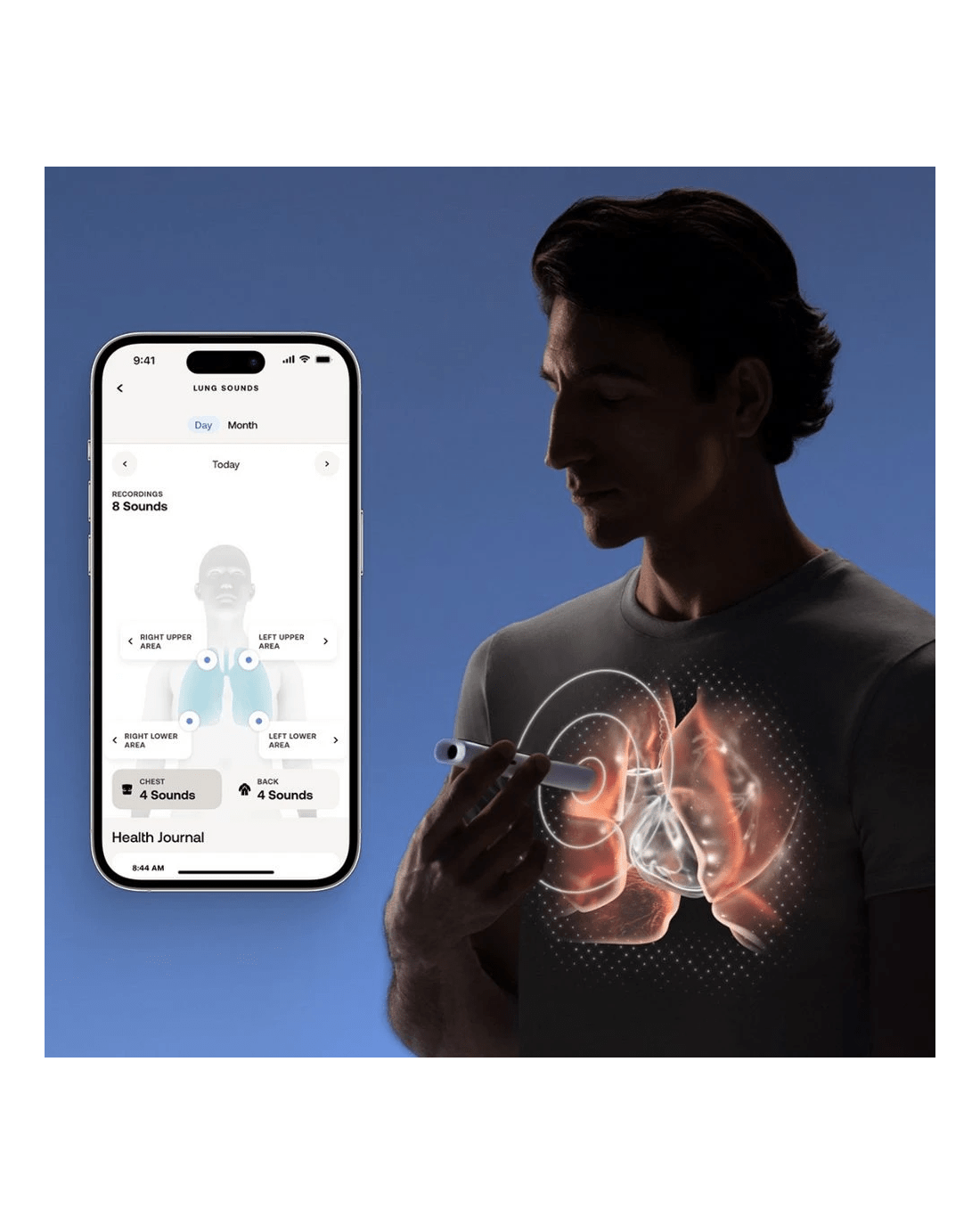 - It captures cardiovascular and respiratory sounds for remote assessment.