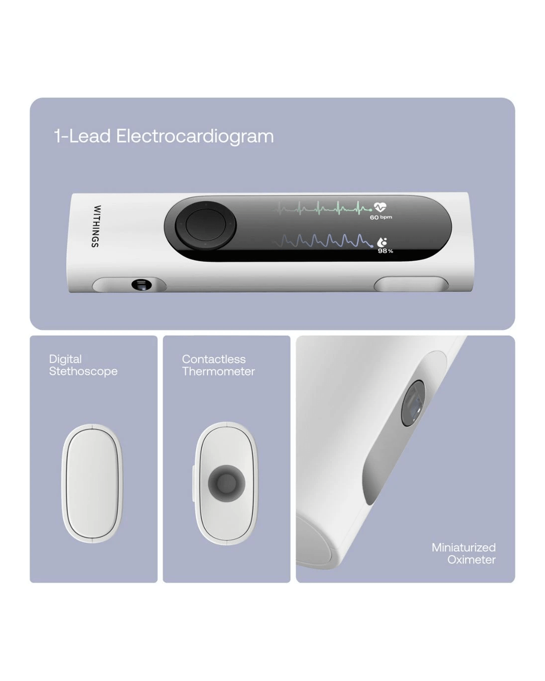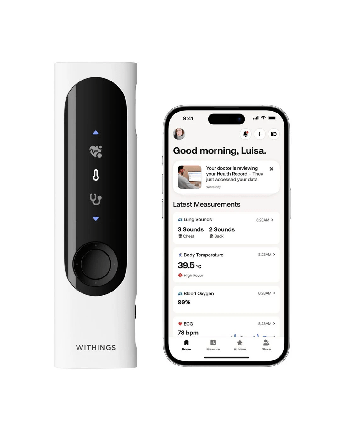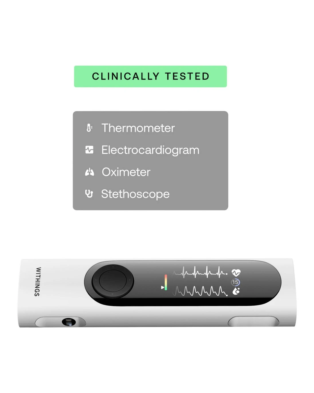 This Withings BeamO is a 4-in-1 health device that combines a thermometer, ECG, pulse oximeter and digital stethoscope in one compact unit. It offers contactless, clinical-grade fever detection and captures heart and lung sounds for real-time sharing with your doctor via the HealthLink app. Plus, it supports up to 8 users, making it ideal for family use.