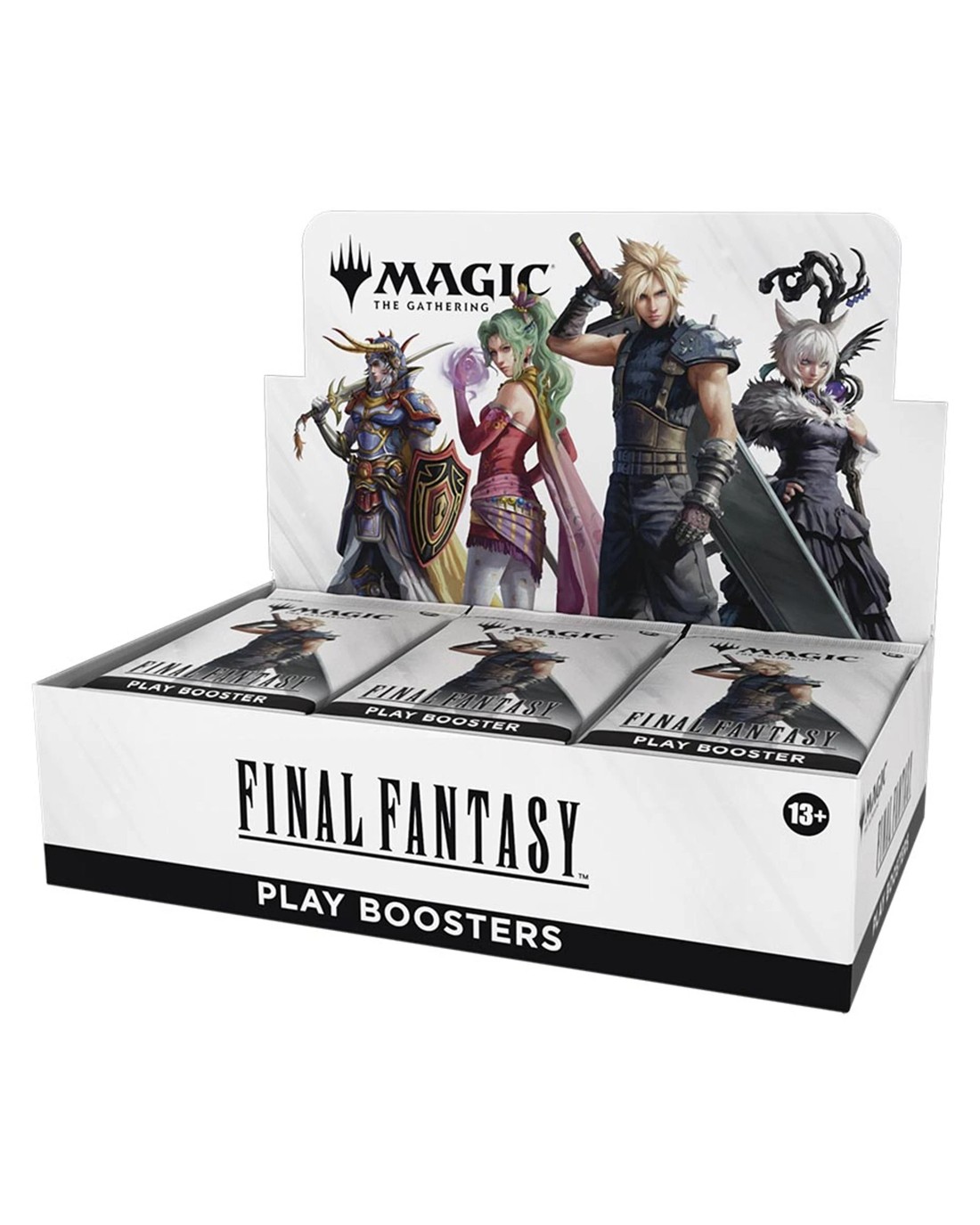 Enter battle in Magic: The Gathering with some of the most iconic characters, items, and moments from the sixteen core games in the legendary FINAL FANTASY series. Step into these unforgettable stories and give them a whole new spin! This Magic: The Gathering—FINAL FANTASY Play Booster Box contains 30 Play Boosters, perfect for both Limited play and opening packs just for fun. Each Play Booster contains 14 Magic: The Gathering cards and 1 Token/Ad card or Art card. (A regular Art card can be found in 30% of packs and a foil-stamped Signature Art card can be found in 5% of packs.) Every pack Includes 1-4 cards of rarity Rare or higher and 3-6 Uncommon, 6-9 Common, and 1 Land cards. One card of any rarity is Traditional Foil. The Land card is also Traditional Foil in 20% of boosters. This product does not contain a serialized card (available in English-language Collector Boosters only). Ages: 13 +