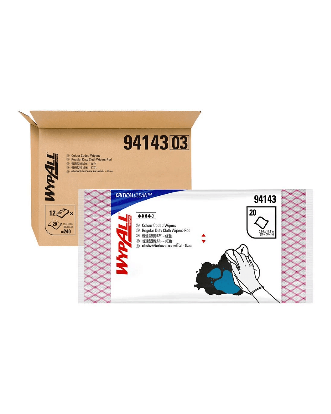 This pack of WypAll Colour Coded Cloths are colour coded for task segregation, reducing the risk of cross-contamination. These regular duty cloths are ideal for cleaning up spills and wiping surfaces as they can easily be rinsed out for reuse.