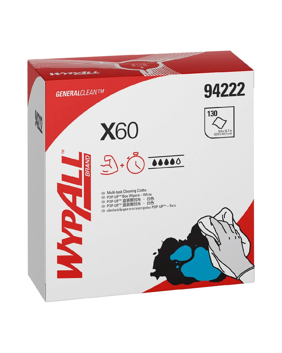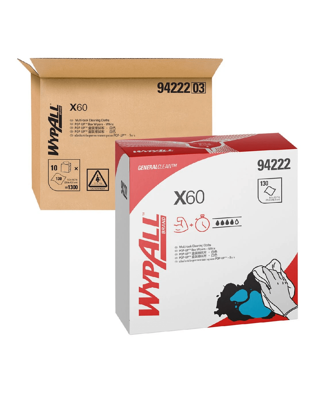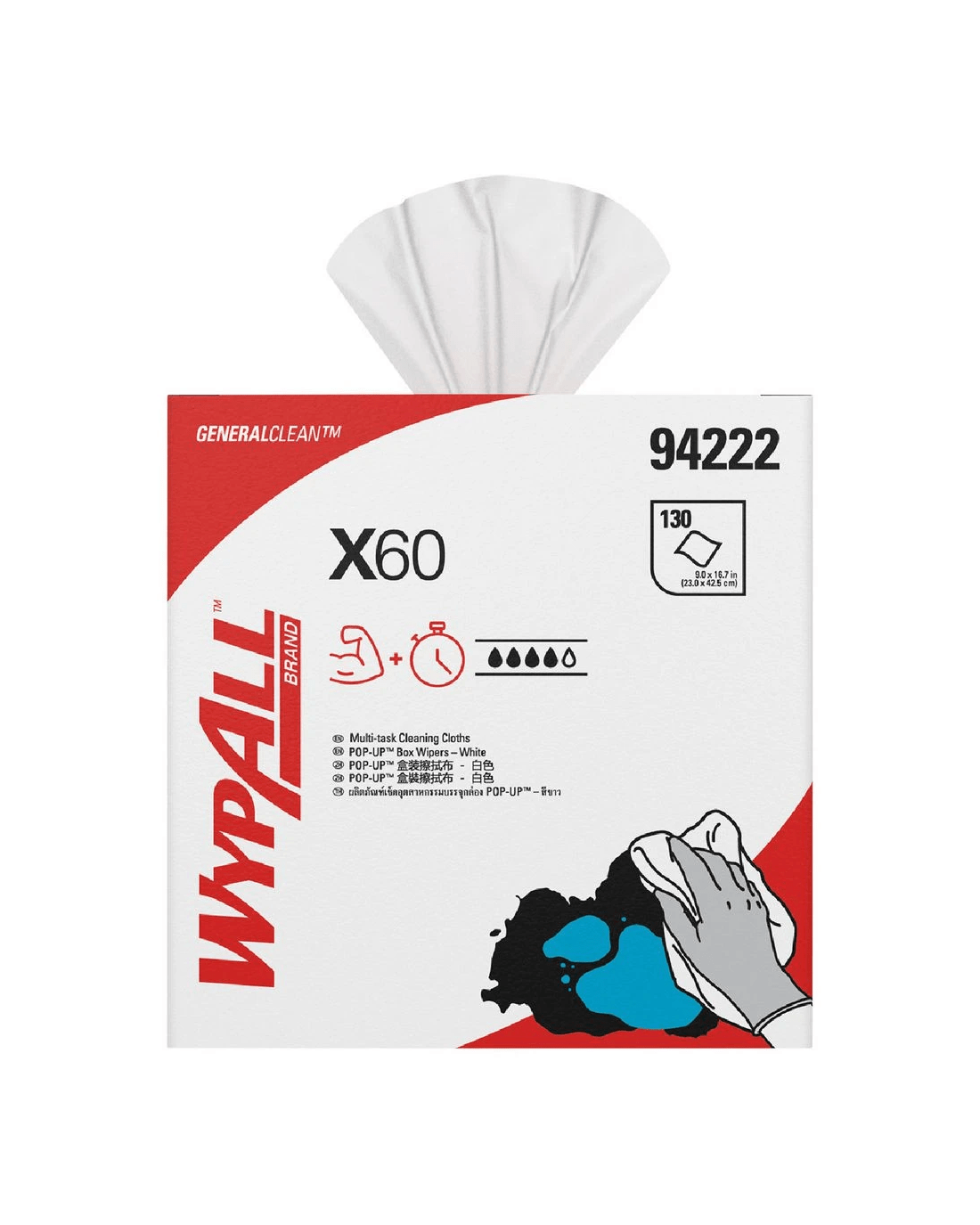 These Wypall X60 Pop-Up Box Wipers are versatile and can be used for a wide range of applications including cleaning machinery, wiping surfaces and wiping up spills. They are lightweight, flexible and soft which makes them ideal for single use, preventing cross-contamination. They are strong when wet, so you can use them as wash cloths.