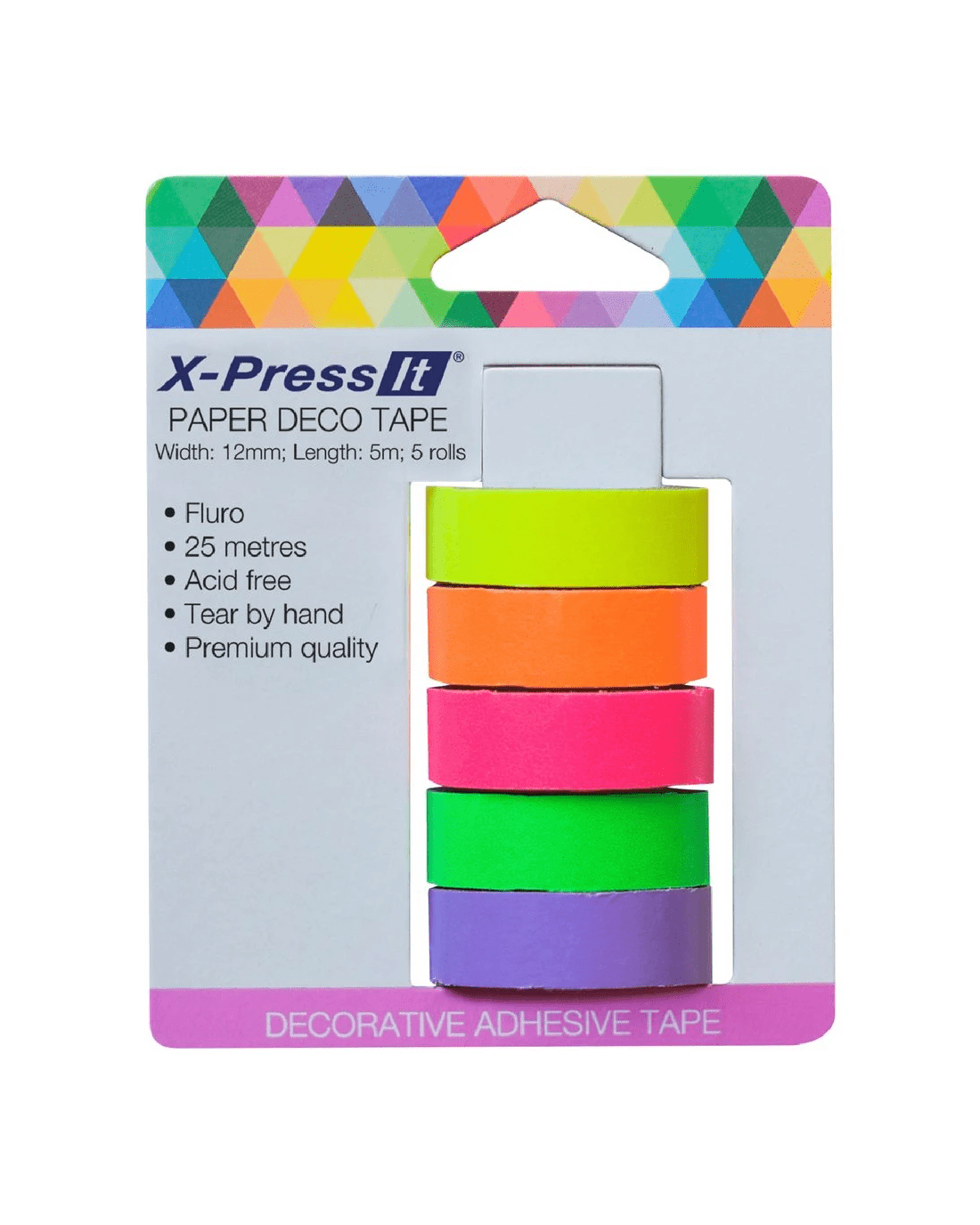 X-Press It Fluoro Deco Tape includes 5 assorted flourecent colours of 12 mm tape. They're ideal for adding a bright accent to all your projects. This tape is also great for decorating, repurposing and craft applications.