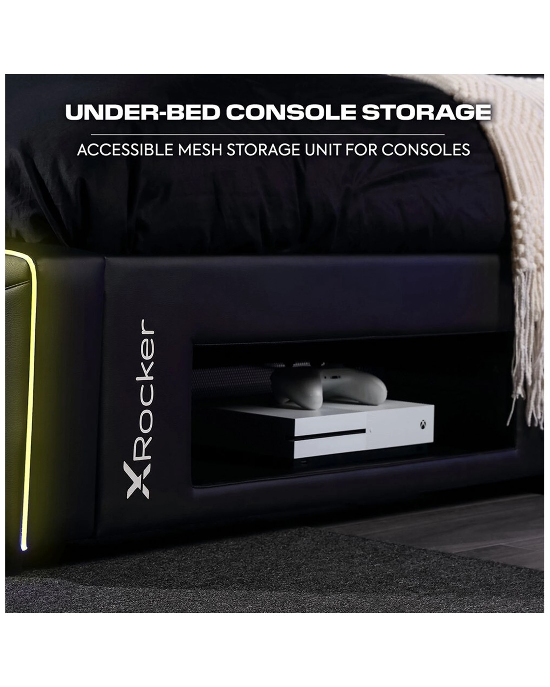 With X Rocker's innovative 360-degree adjustable TV bracket and luxurious faux leather, the Oracle Neo TV gaming bed is the stuff that dreams are made of. Built to accept TV's up to 32*. Equipped with Neo Fibre LED, with multiple single colour lights and effects to suit your style.