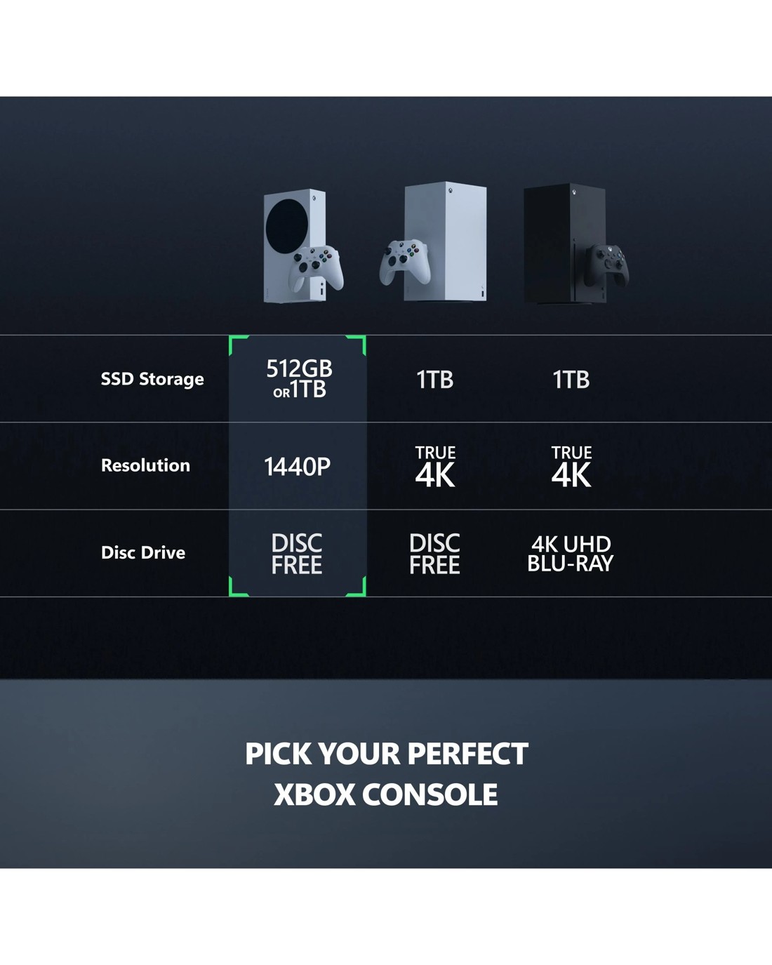 Power your dreams Experience next-gen speed and performance with Xbox Series S in White, featuring a 1 TB SSD. Make the most of every gaming minute with Quick Resume, lightning-fast load times, and gameplay of up to 120 FPS - all powered by Xbox Velocity Architecture. Enjoy digital games from four generations of Xbox, with hundreds of optimized titles that look and play better than ever. Get the most out of your Xbox Series S with Xbox Game Pass Ultimate (membership sold separately) and be the first to play new games like Starfield and Forza Motorsport on day one. Plus, enjoy hundreds of games like Minecraft Legends, Halo Infinite, and Forza Horizon 5 with friends on console, PC, and cloud. With games added all the time, there's always something new to play. * Use with digital games only; console does not play physical discs. 120 FPS: Requires supported content and display; use on Xbox Series S as content becomes available. Xbox Game Pass: Game catalog varies over time (xbox.com/gamepass). Xbox Cloud Gaming (Beta) requires Xbox Game Pass Ultimate subscription and supported game; may require supported Bluetooth controller (all sold separately). Select regions and devices. Streaming limitations apply, server availability and wait times may vary. Requires internet, ISP fees apply. xbox.com/cloudgaming