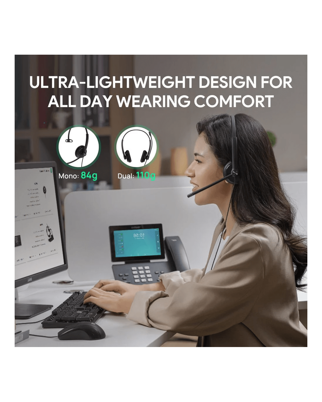 The Yealink UH34 Lite Mono is a professional USB wired headset with crystal clear audio. It’s designed with Ultra lightweight and replaceable soft foamy ear cushions to wear even for an entire workday. Plus, it’s suitable for workers who spend a lot of time wearing headsets for voice communications.