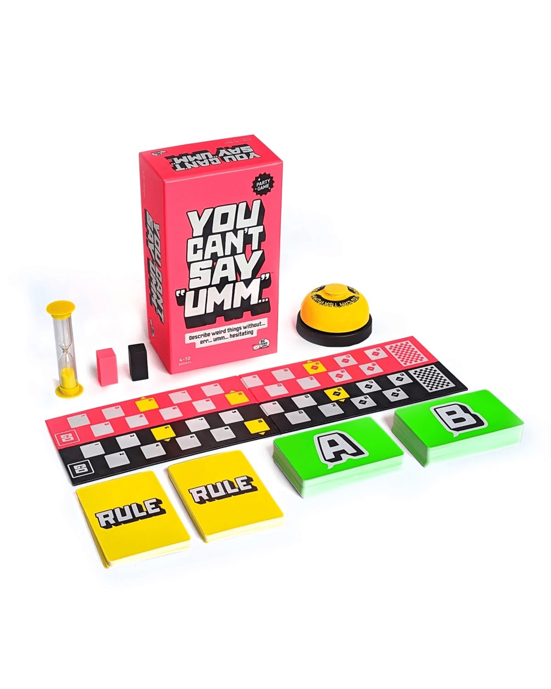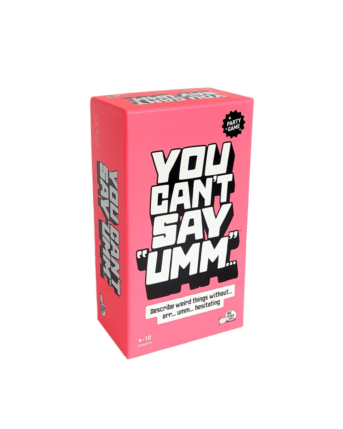 Describe weird things without?err?uhh?hesitating. This is a noisy party game with one super, simple mission - you can?t say 'umm'. Two teams race to get their pieces to the end of the board first. They?ll do it by describing as many strange sounding objects as they can, from the random cards they pick up.