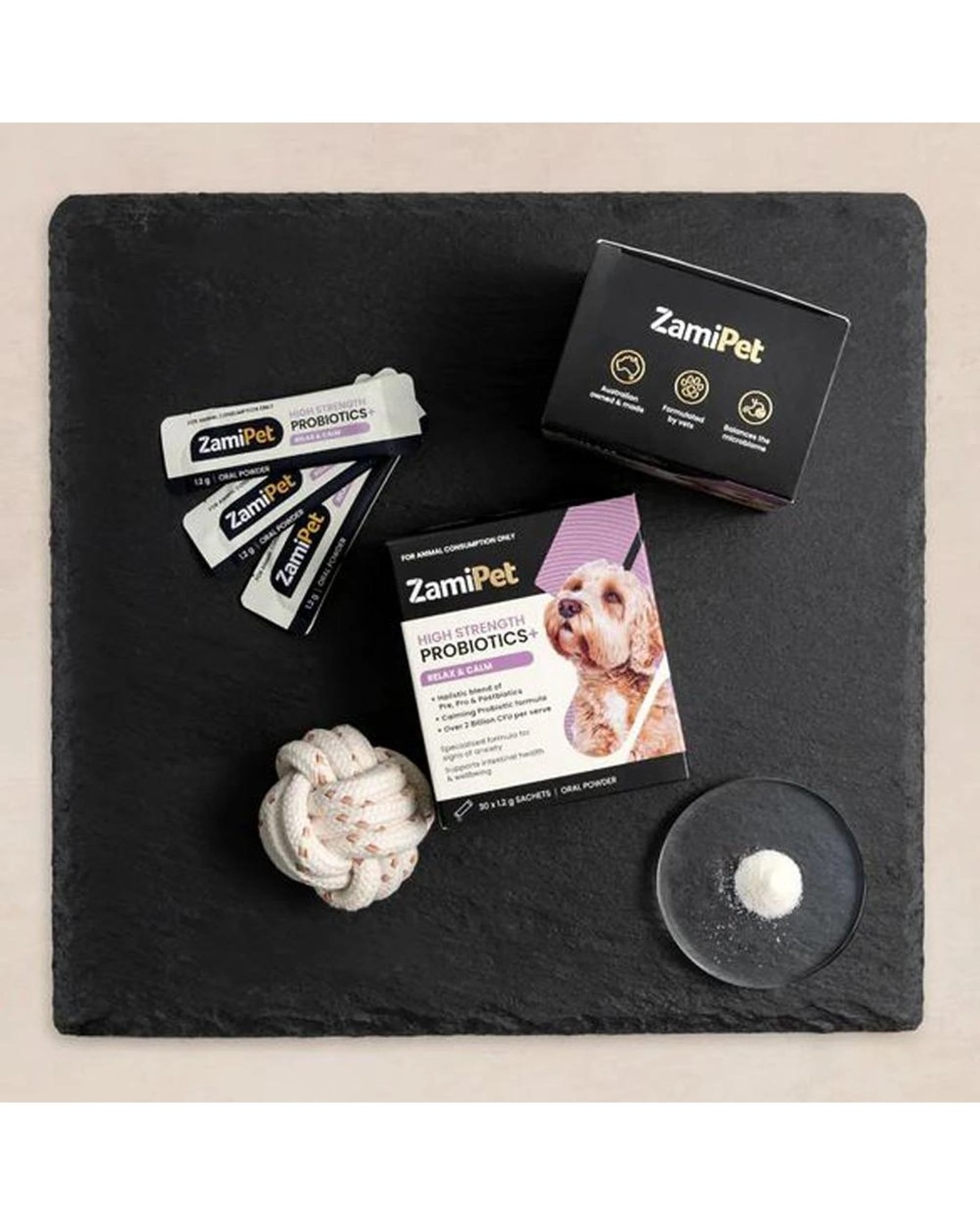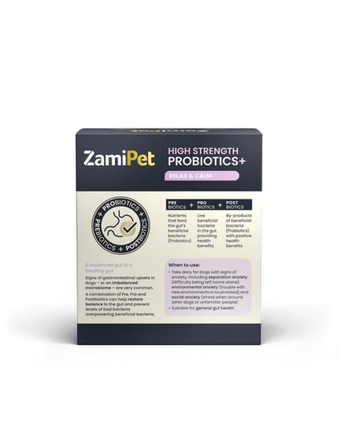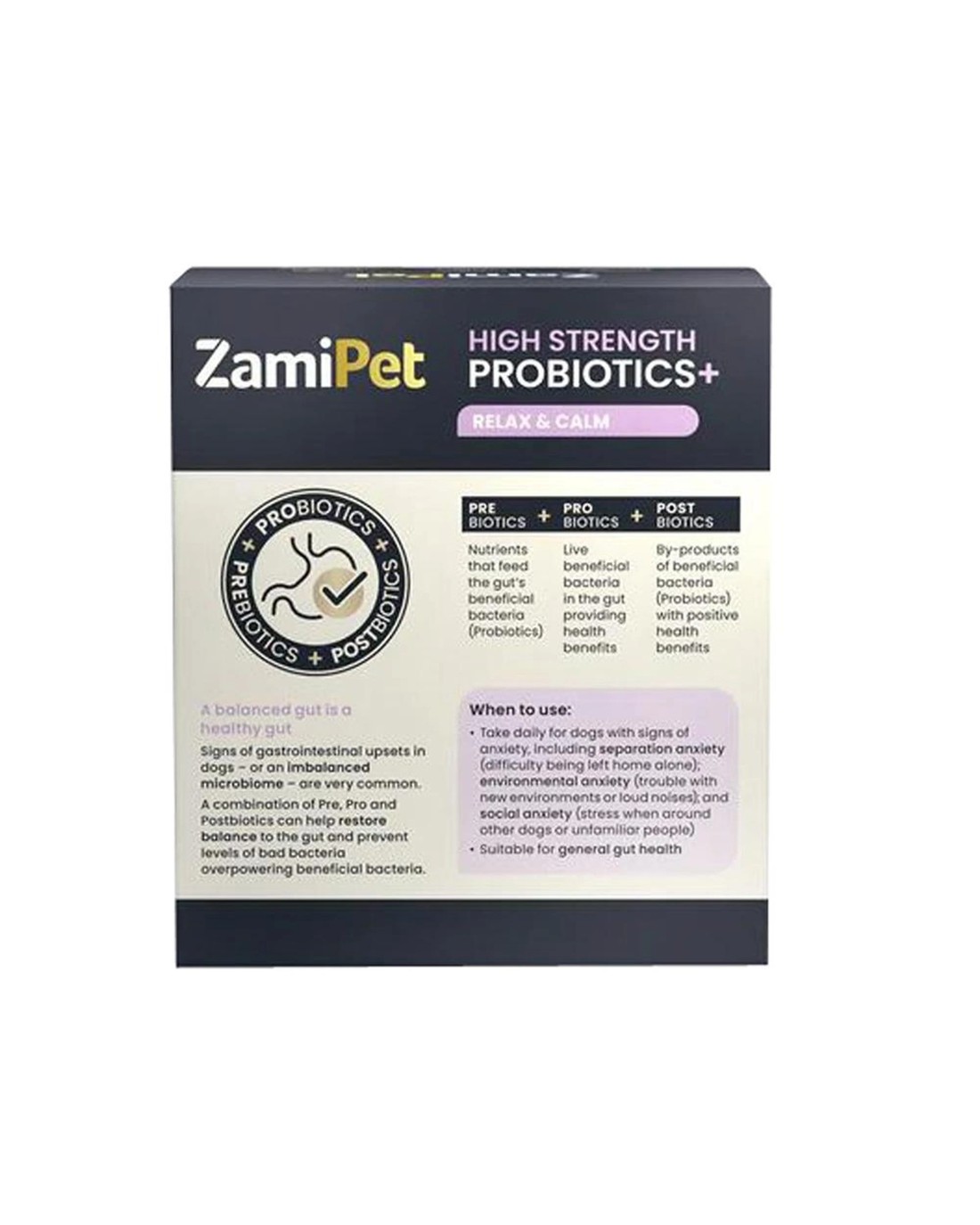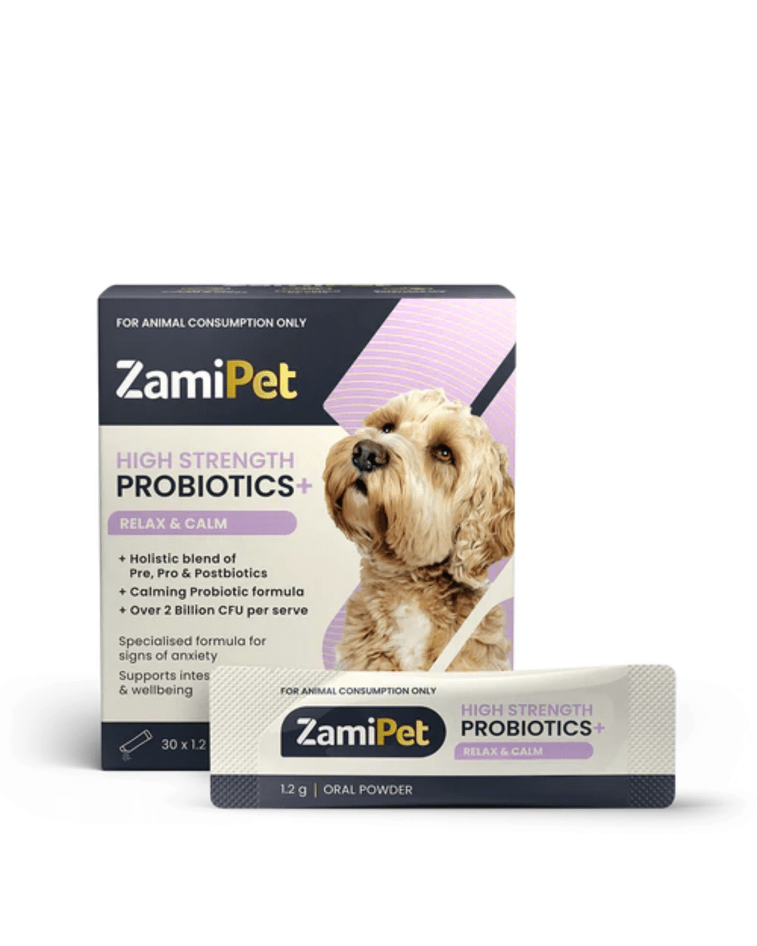 ZamiPet High Strength Probiotics+ Relax & Calm contains a holistic blend of Prebiotics, Probiotics, and Postbiotics in convenient single-serve sachets, specially formulated for dogs showing signs of anxiety and to support gut health.