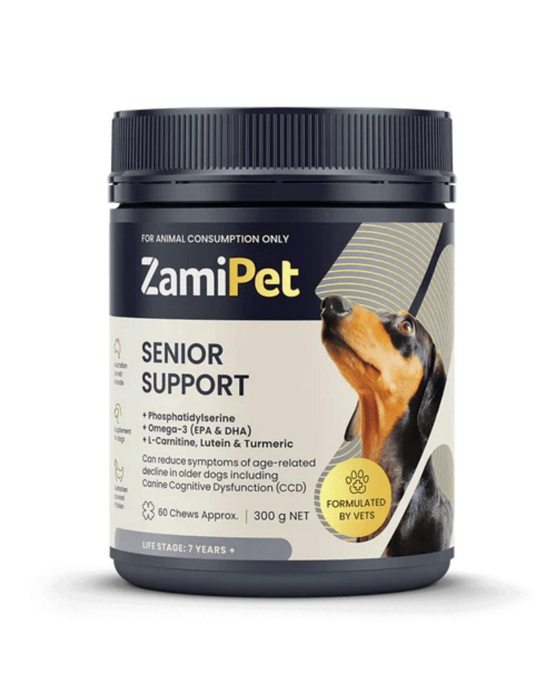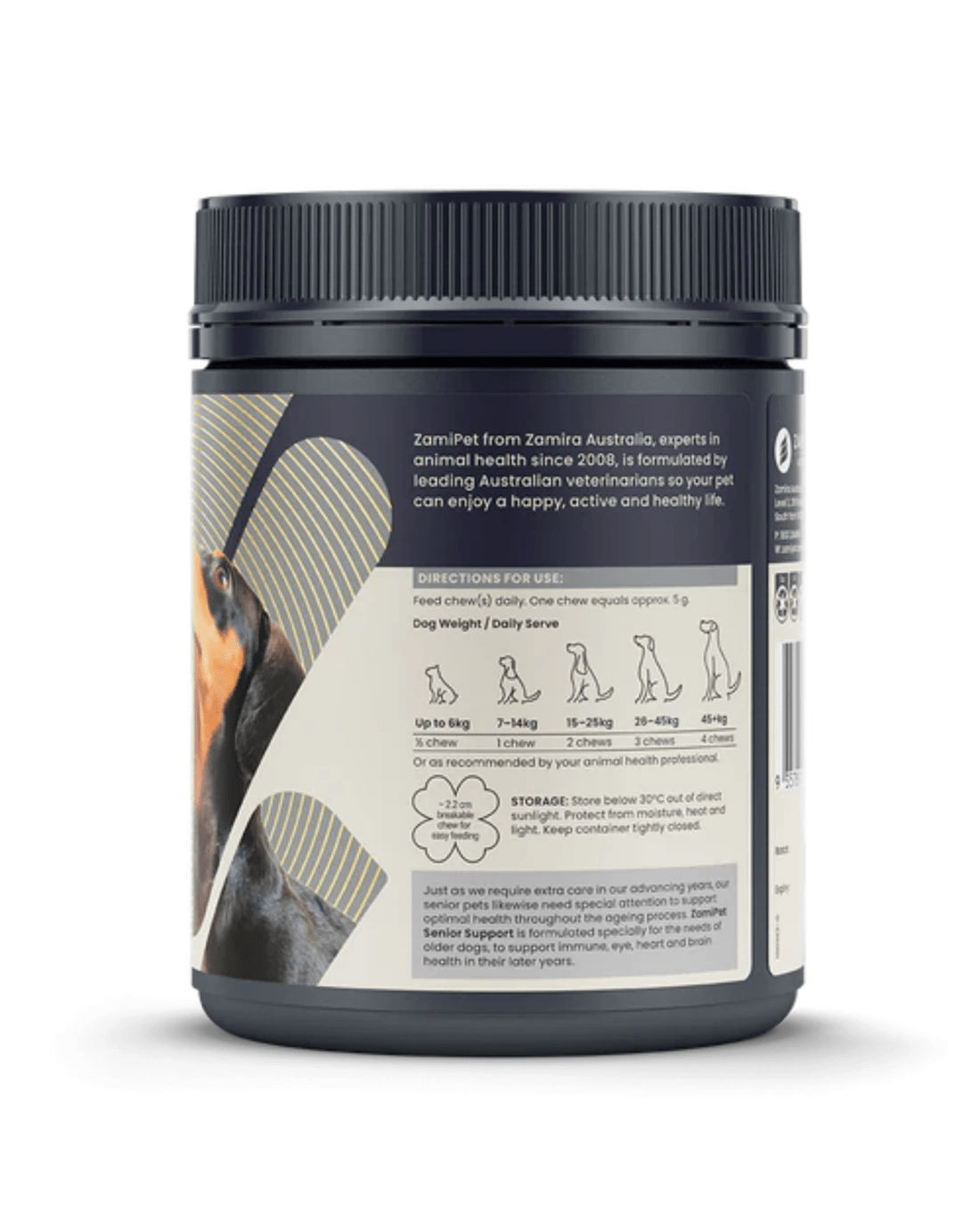 ZamiPet Senior Dog Supplement is a tasty, breakable chew designed to support joint health, cognitive function, digestive health, and overall vitality in ageing dogs. It contains Omega-3, Turmeric, CoQ10, L-Carnitine, Glucosamine, Chondroitin, MSM, Prebiotics, and Probiotics to help alleviate age-related decline.