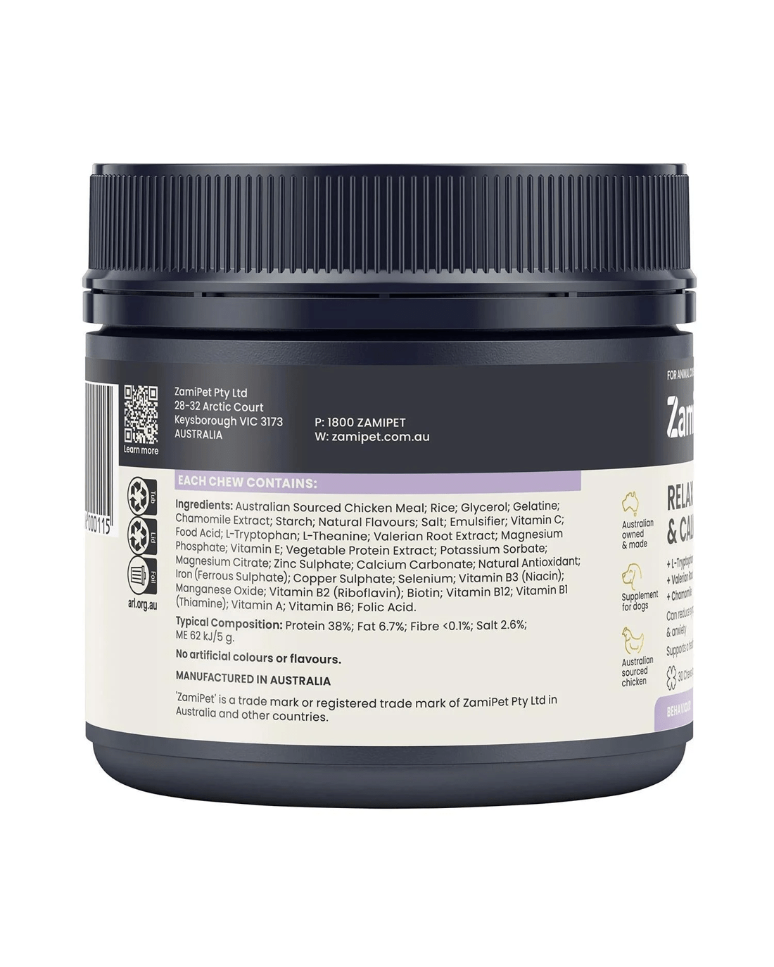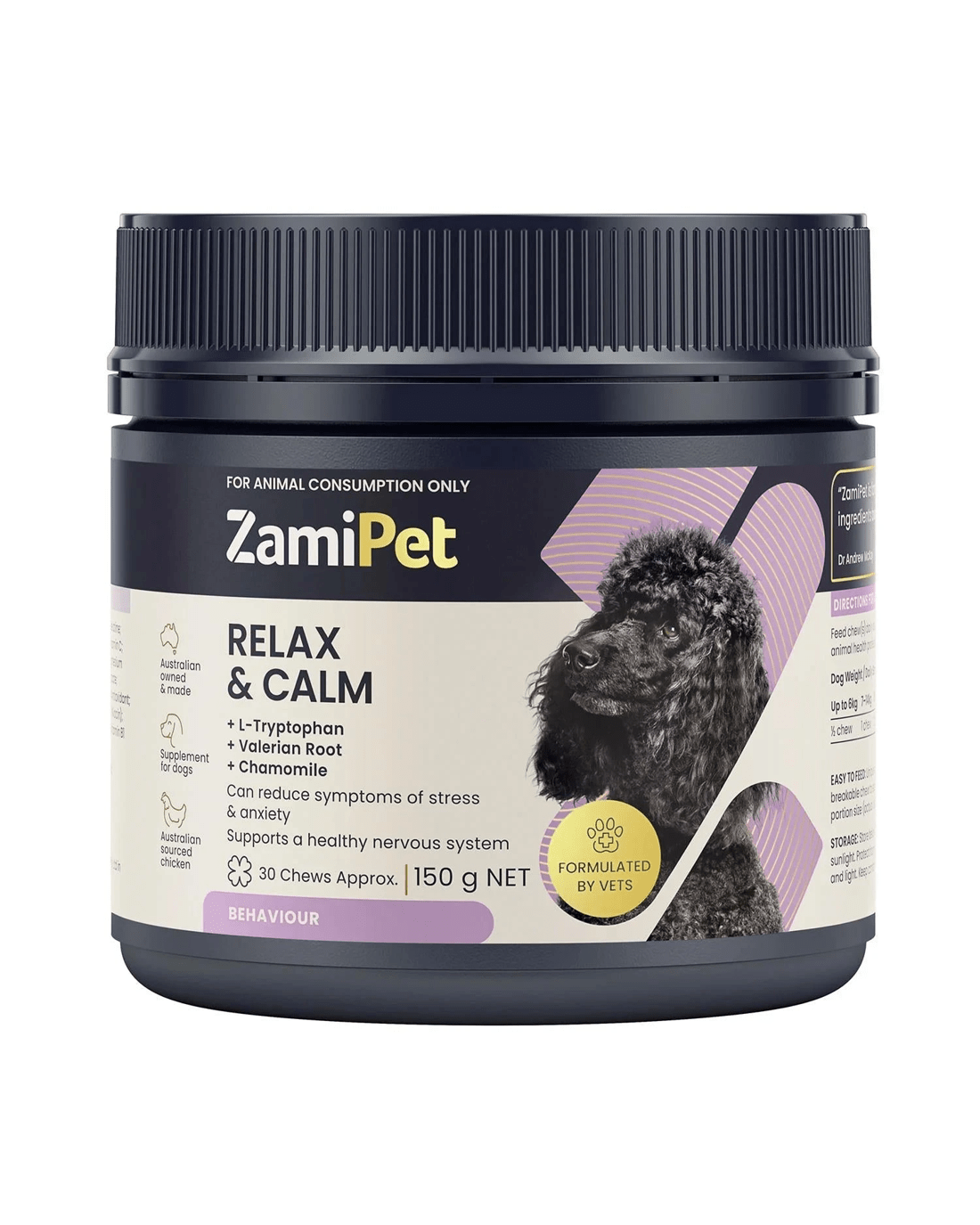 Zami Pet Relax & Calm is a great tasting, breakable chew containing L-Tryptophan, Valerian Root, Chamomile and L-Theanine to support a healthy nervous system in dogs and may reduce symptoms of stress and anxiety, without making your pet drowsy.