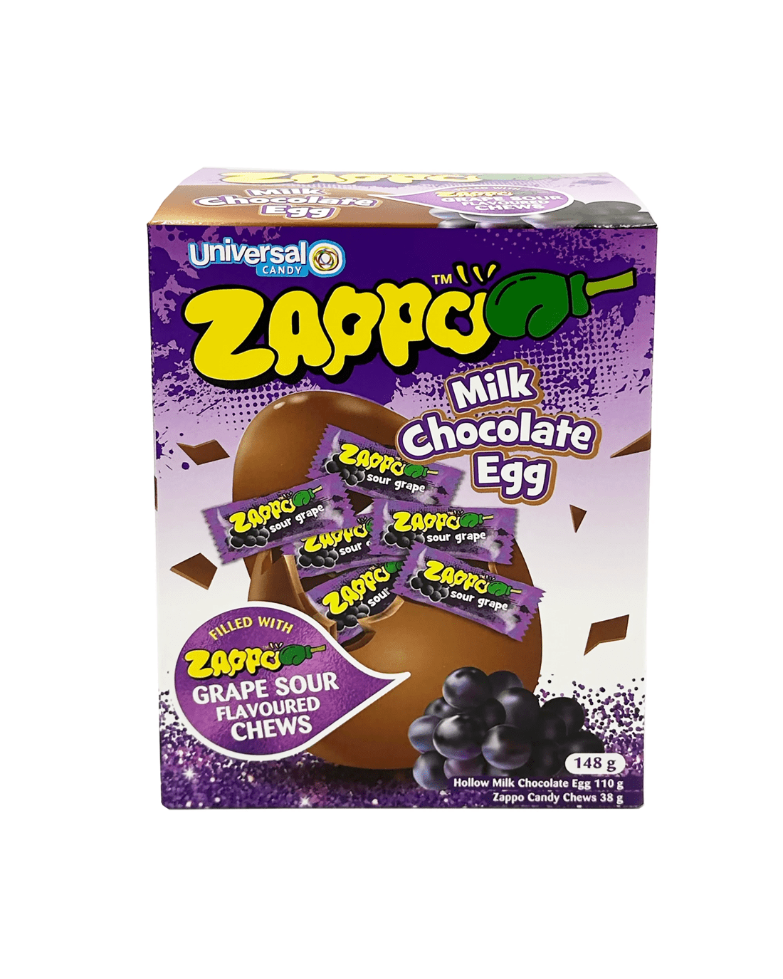 Delicious chocolate Easter egg with a surprise inside - tangy Zappo Grape Chews! This fun treat combines smooth, creamy chocolate with Zappo’s signature bold grape flavour for a sweet and sour Easter surprise.