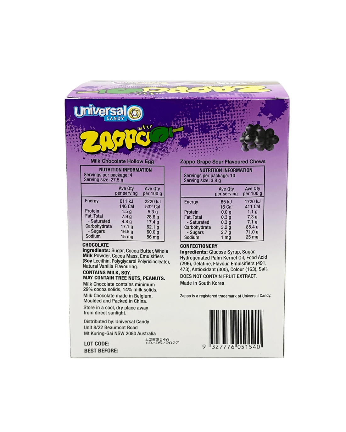 - Made in Belgium (Hollow Milk Chocolate Egg) and made in South Korea (Zappo Candy Chews)