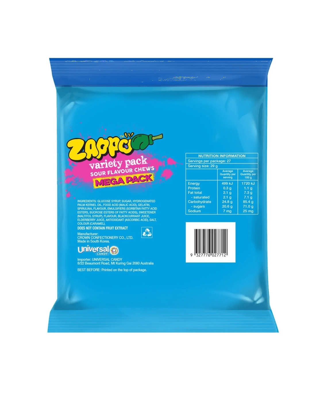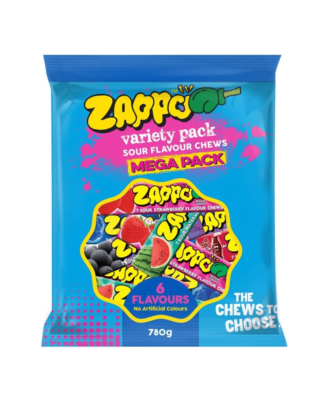 Six of your favourite Zappo flavours in one variety pack for family and friends to enjoy. The iconic Zappos with bursting flavours like grape, raspberry and watermelon will be sure to bring some delicious nostalgia to your tastebuds with the flavours we all know and love! The Chews to Choose!