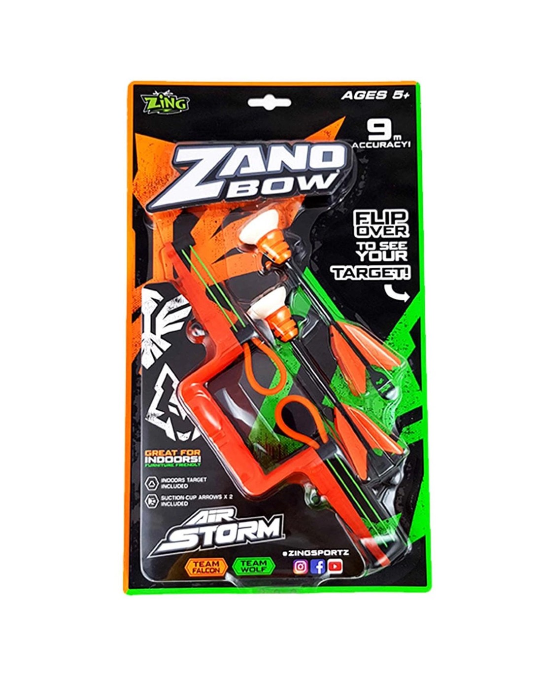 The Zing Air Storm Zano Bow is the mini bow and arrow combo. Load the bow with a Zartz suction cup arrow, pull back, then ready, aim, fire. This set is great for indoor playing. You can set up a target, included in the set and practice your accuracy and watch the Zartz suction cup arrow fly over 9 metres and stick to almost anything. The great design of the zartz suction cup arrow is the patented technology. Each arrow is made with ultra-light foam and flies over incredible distances. Ages: 5 +Contents