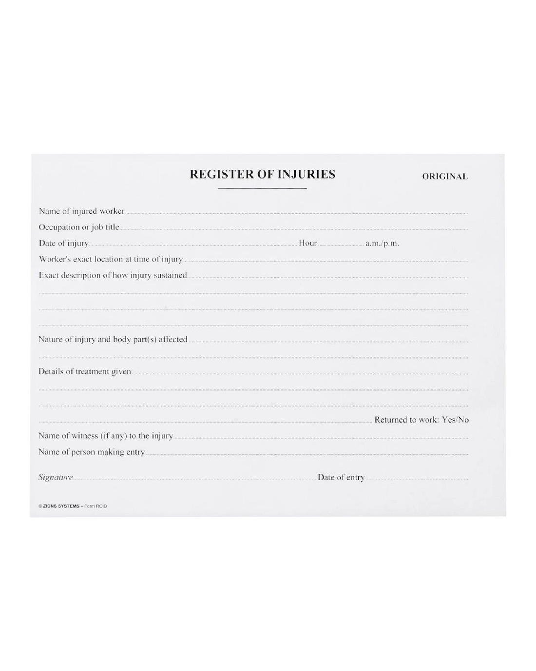 This Zions Work Cover Register of Injuries Victoria Book is a great place to record incidents that occur in the workplace. The pages are pre-printed so that you can easily fill in your details. Each copy has a duplicate page so that you can keep 1 in the book for reference and so that you can send 1 to the appropriate recipient.