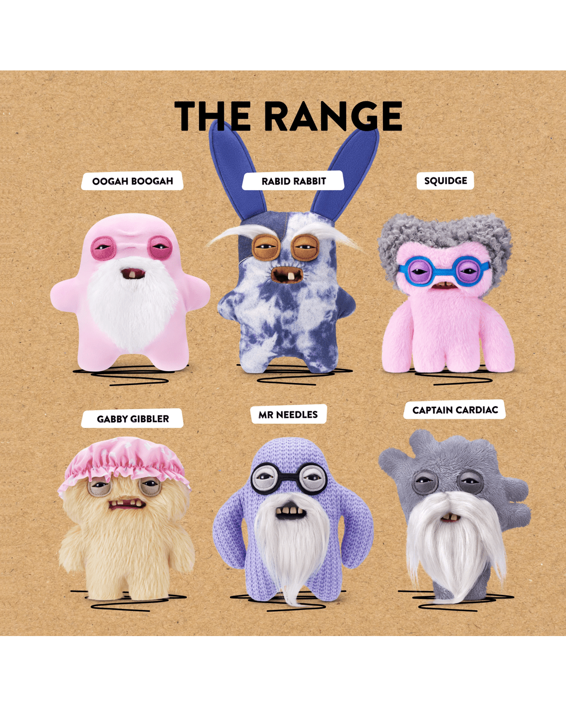 Unleash the chaos of cranky cuteness with the Fuggler Old Fogies 22cm plush by ZURU! These 22cm stuffed animals might look like harmless, wrinkly grandparents with gray fuzz and squinty eyes, but they're scheming plush troublemakers at heart. After decades of perfecting the art of being delightfully uncomfortable weirdos, these senior creatures are the ultimate recipe for disaster disguised as sweet old plushies who 'just want to pinch your cheeks.' Perfect for kids, tweens, teens and adult collectors, Old Fogies are ideal for role play, pretend play or hilarious shelf display. Each Fuggler features soft plush, disturbingly human-like teeth and the rare Butt-on Hole for collector bragging rights. Collect all 6 Old Fogies and let their grumpy, mischievous charm wreak havoc on your home or your plush collection.