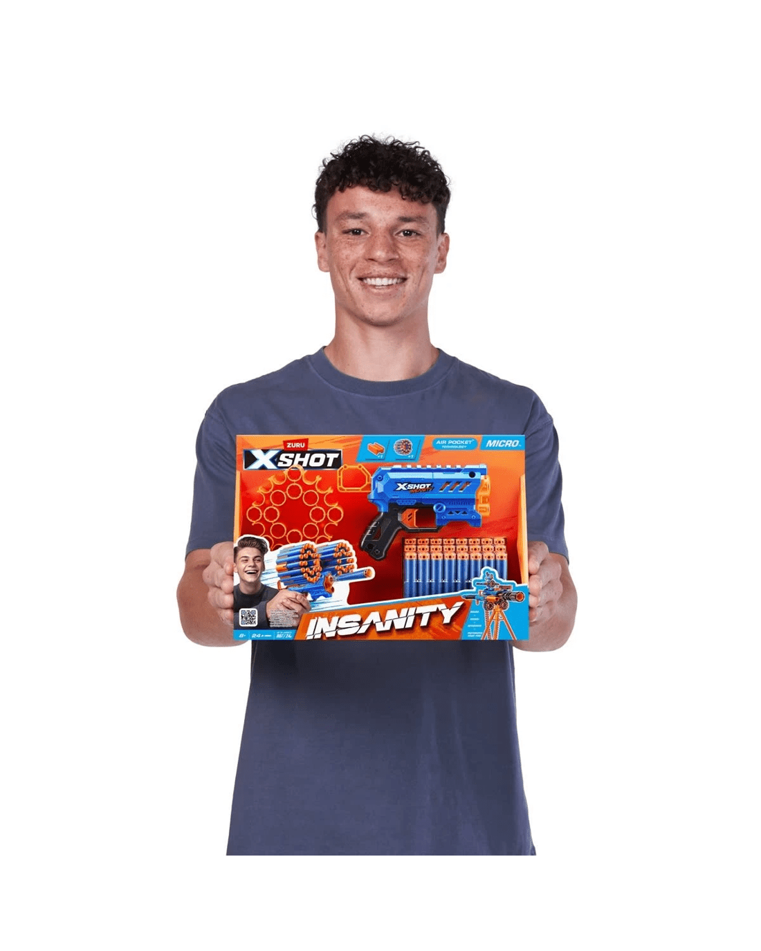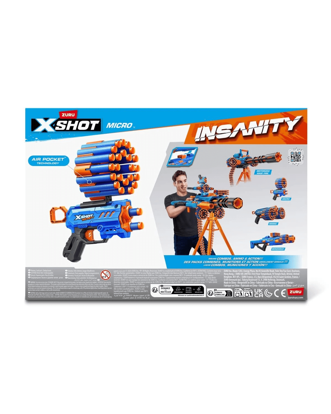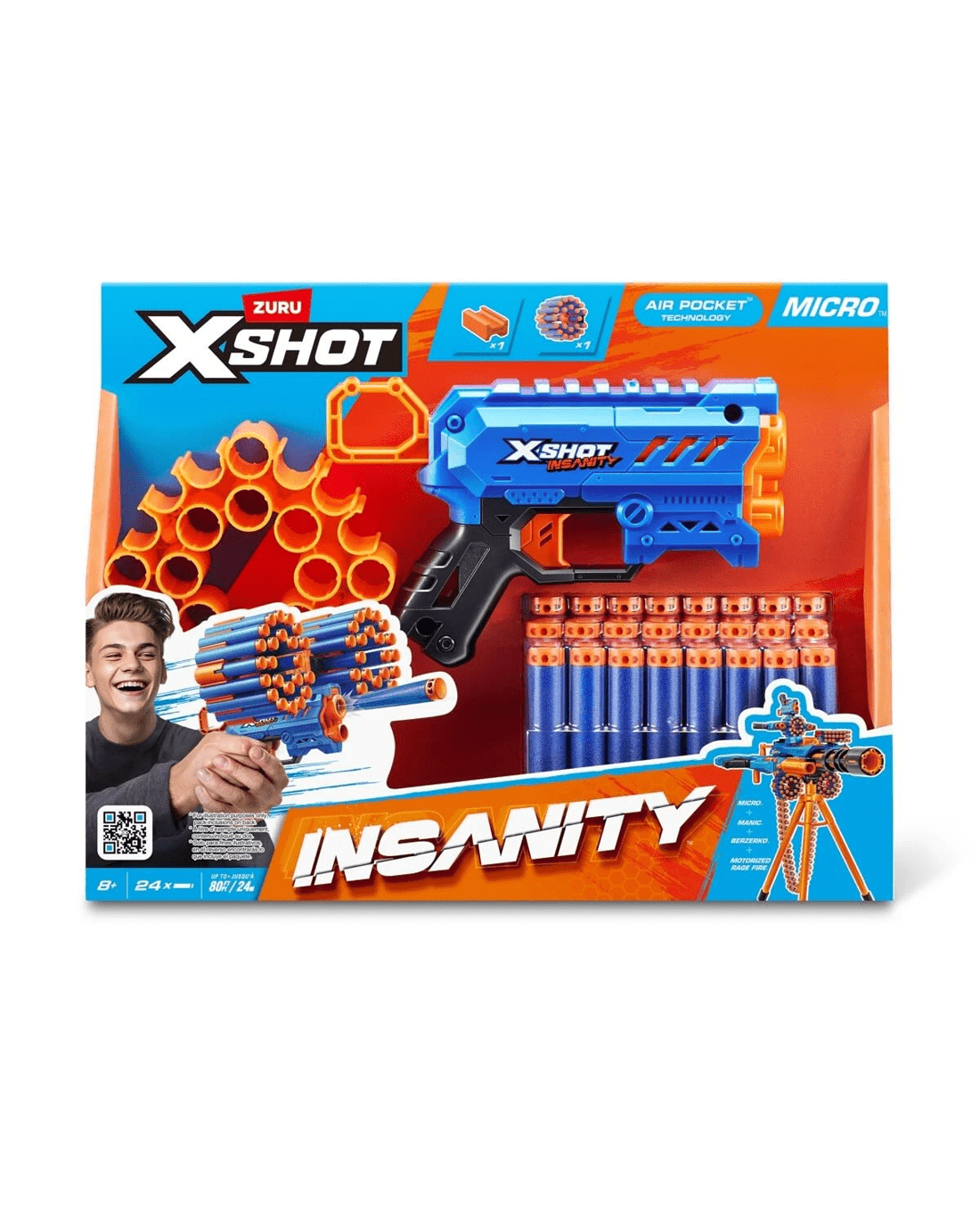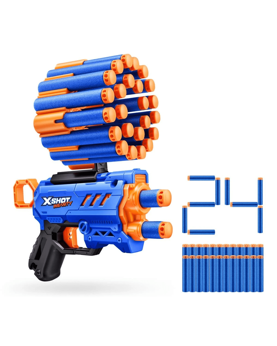 - Includes 1 x X-SHOT Insanity Micro Blaster, 24 x Air pocket Technology foam darts, 1 x side modular dart storage unit and 1 x connector