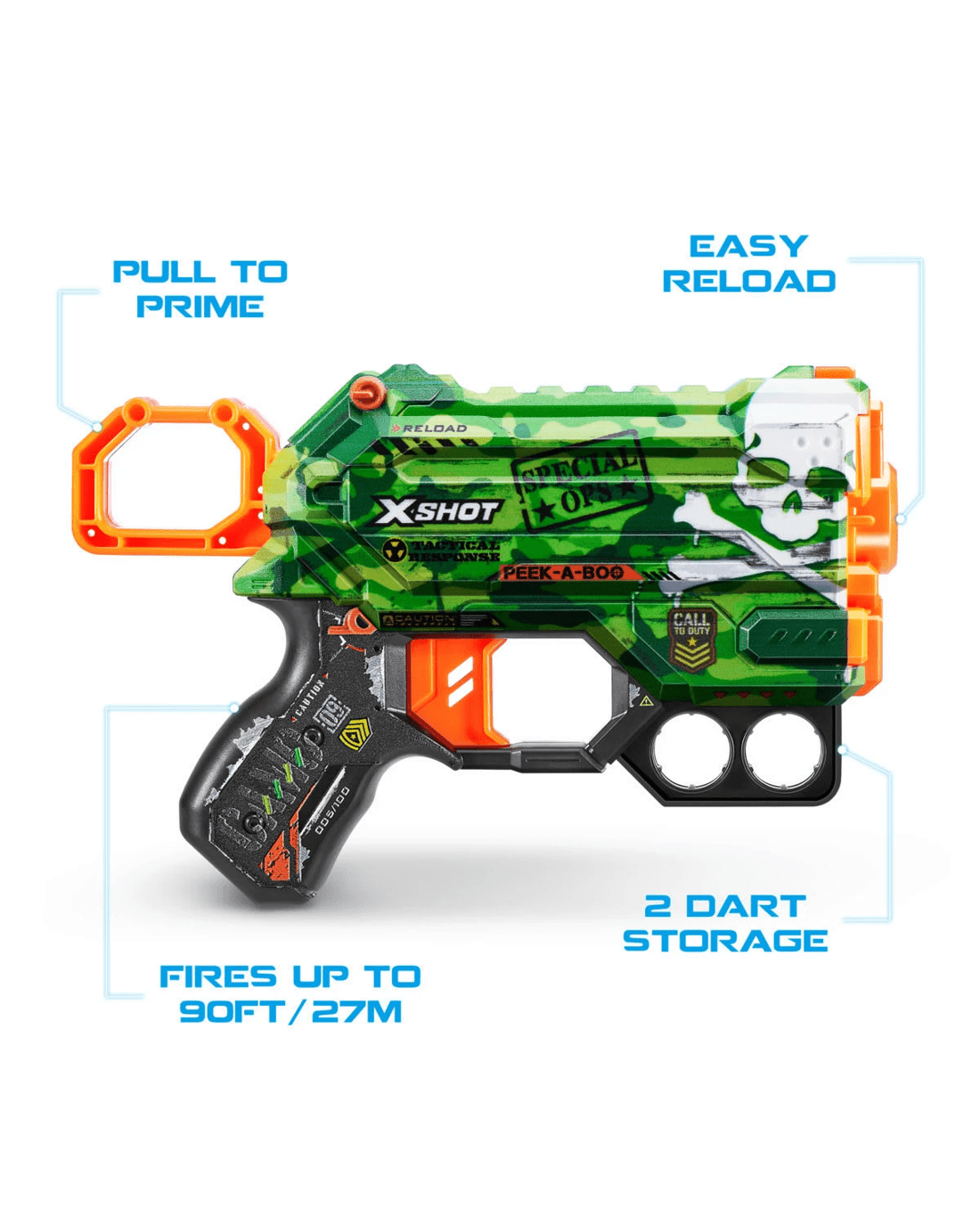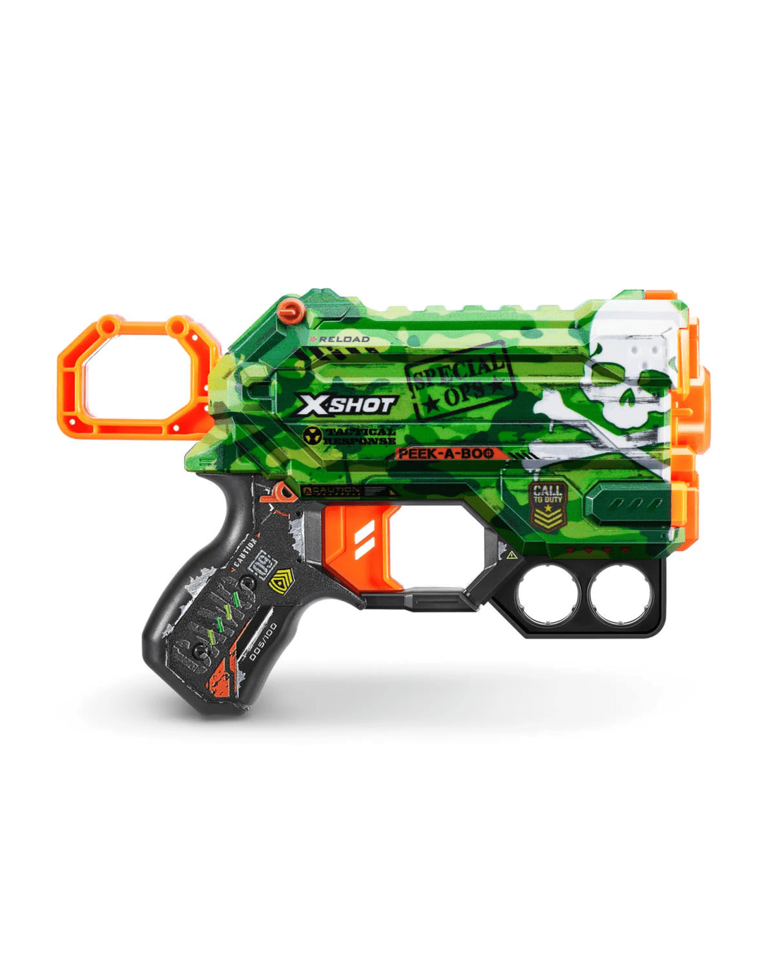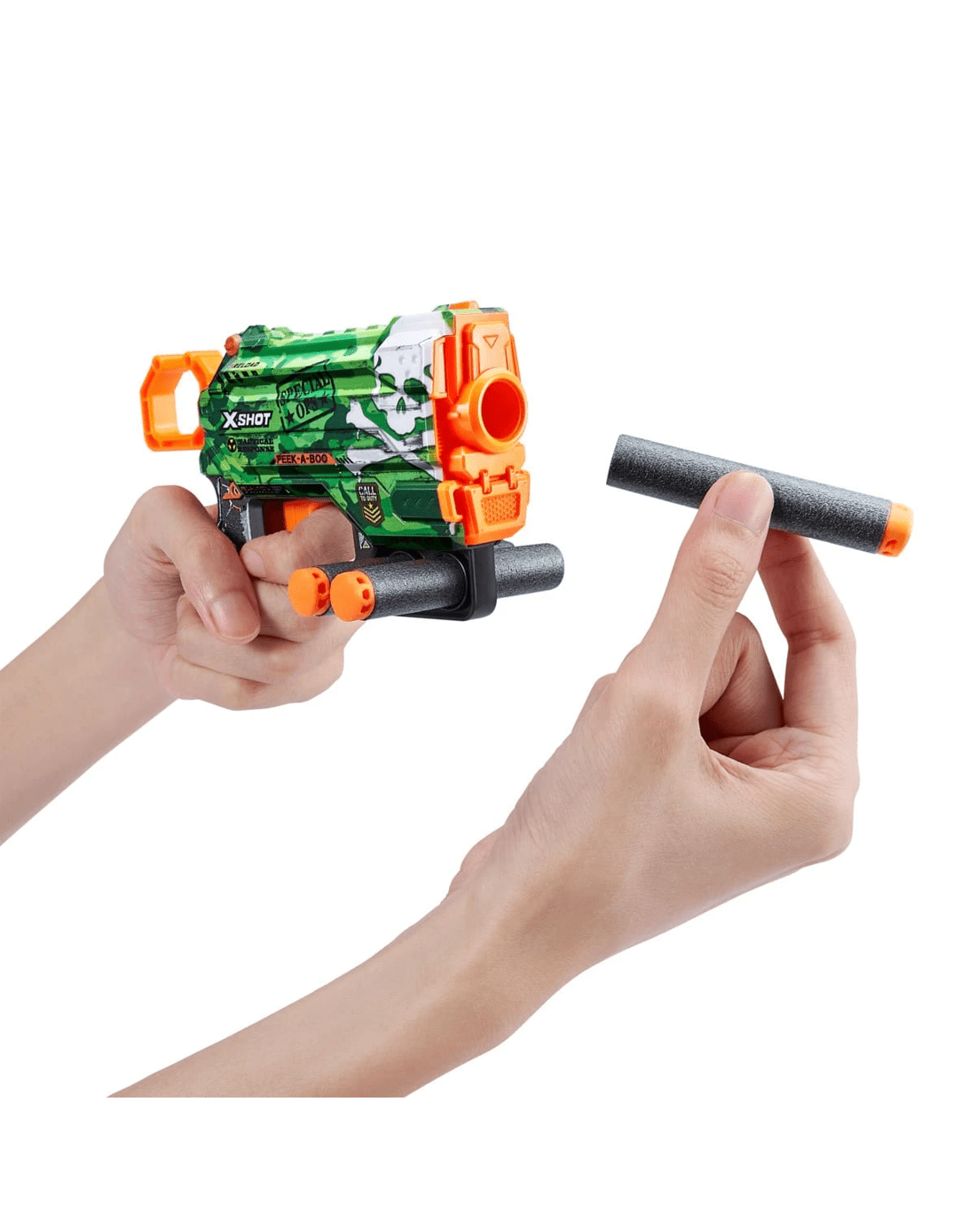 X-Shot Skins brings the in-game experience of skinning your blaster into the real world, choose your Skin and join the battle. The X-Shot Skins Menace Camo is the perfect small blaster to blend in for battle. It packs enough power to take on targets 27m / 90 feet away! Easy to reload, it comes with bottom dart storage so you can quickly reload and get back into the action.